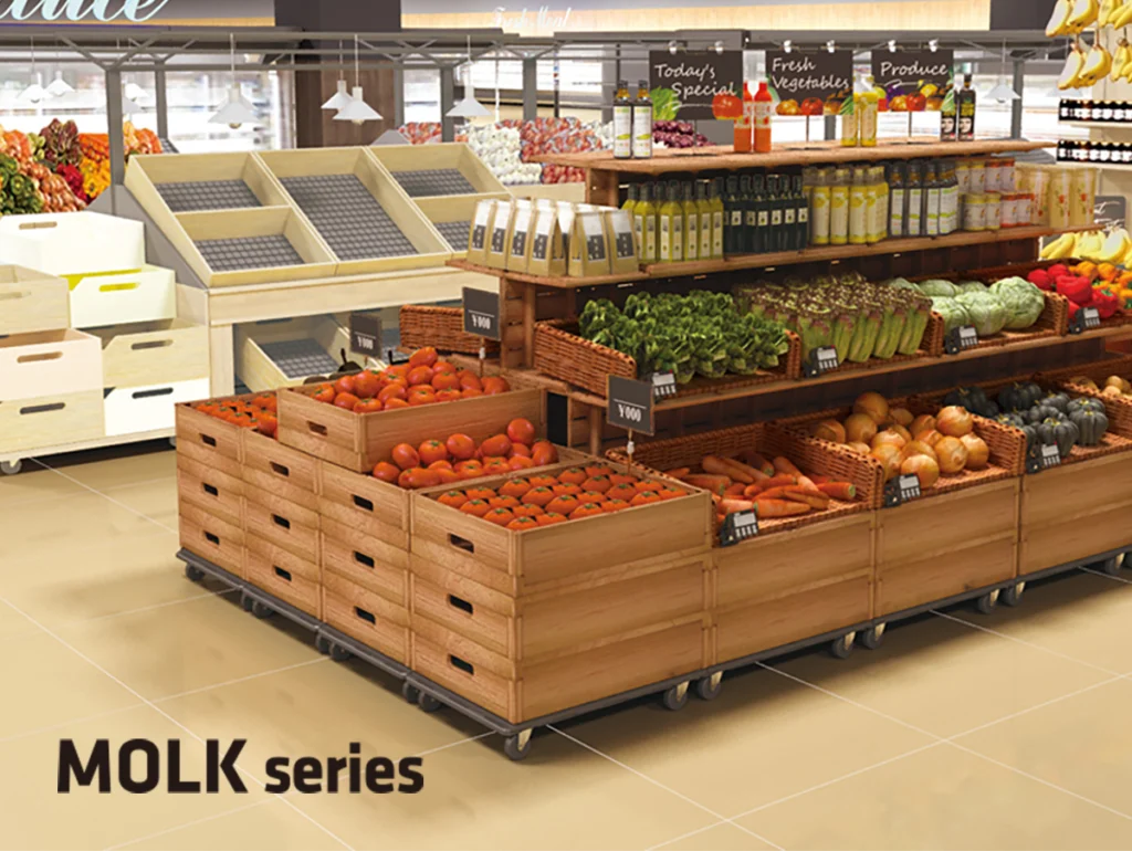 自然に風化した木材のような凹凸を製品に施し、木の生命力を感じさせる風合いを表現しました。この製品を置くだけで、自然の美しさを堪能できる魅力的な売り場を目指しています。